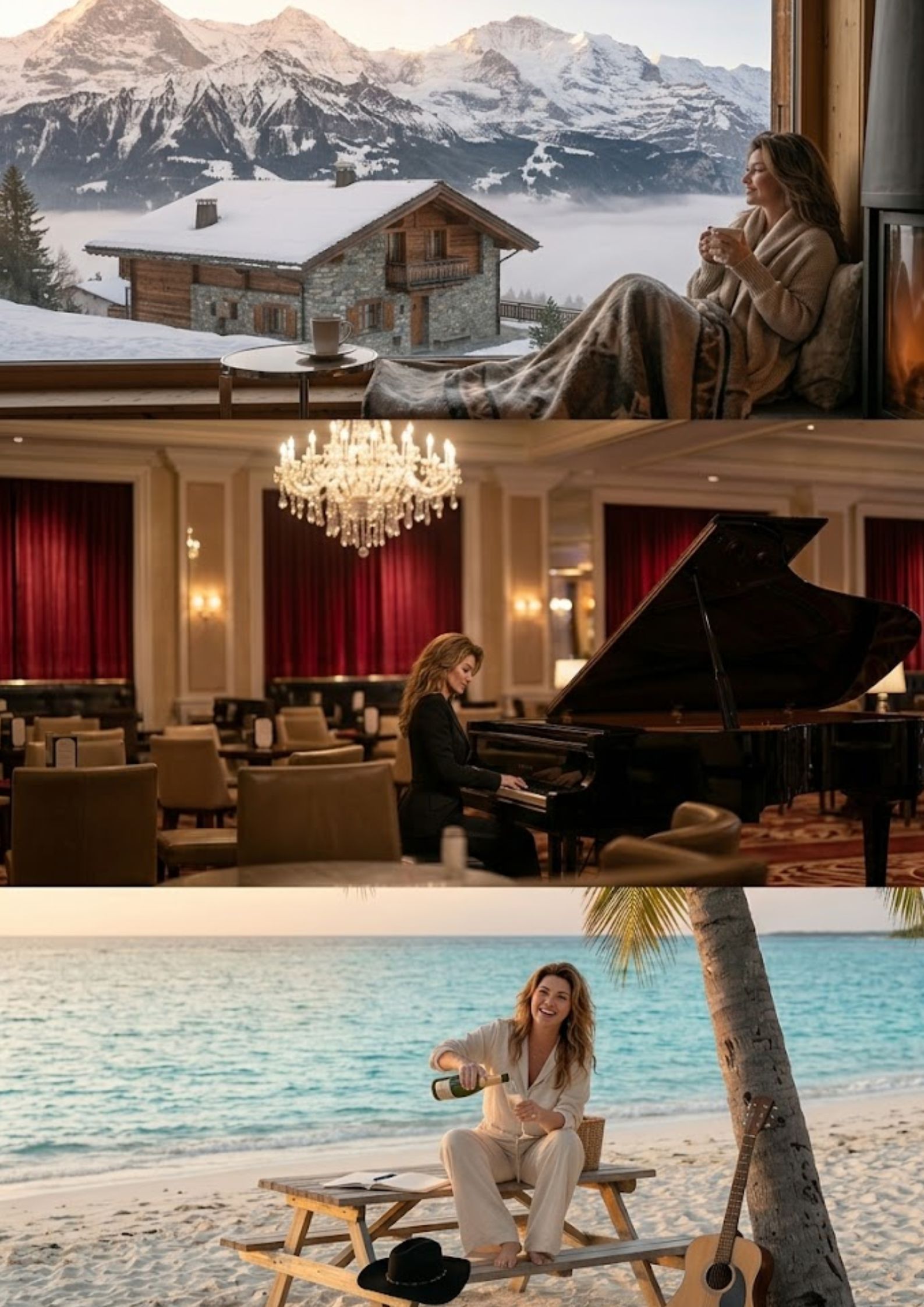 To understand Shania today is to understand her “triangle” of existence. While her residency at Caesars Palace, titled Still the One, demands a high-octane professional presence, her soul clearly finds its nourishment elsewhere. She revealed that her life is currently balanced between the rugged beauty of Switzerland, the vibrant energy of Las Vegas, and the crystalline tranquility of the Bahamas. For a woman who grew up in the harsh winters of Ontario, Canada, this geographical diversity seems less like an indulgence and more like a hard-earned peace.