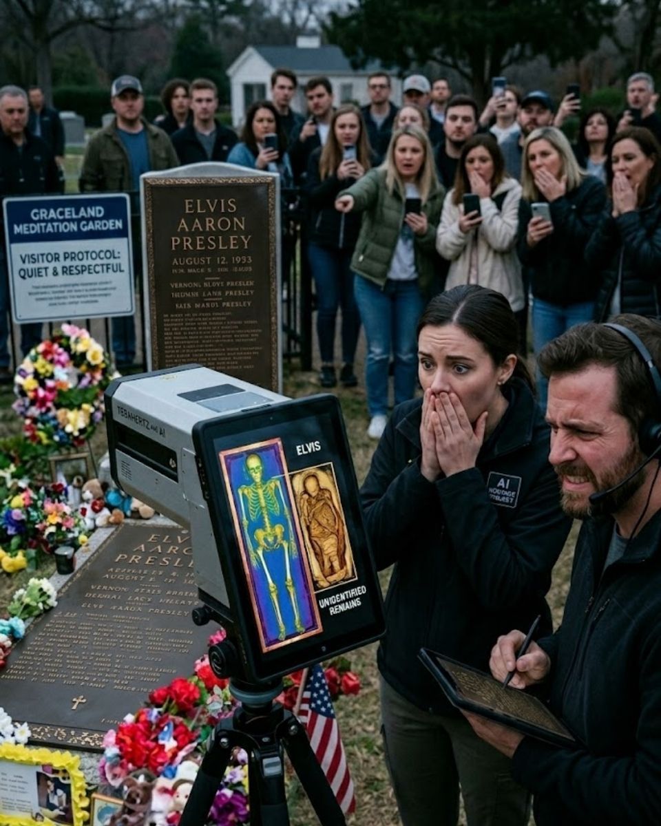 Shocking News: The world of music and history has been rocked to its core by a groundbreaking technological revelation. For over five decades, the final resting place of Elvis Presley at Graceland has been a site of pilgrimage, shrouded in respect and a touch of mystery. However, a recent operation using advanced Artificial Intelligence and Terahertz imaging has done what was once thought impossible: scanning the interior of the King’s casket without ever disturbing the grave. What the sensors picked up has sent shockwaves through the global community, challenging everything we thought we knew about the death of the world’s most iconic entertainer. This is not just another conspiracy theory; this is a data-driven look into a mystery that has been sealed beneath the earth for 51 years.