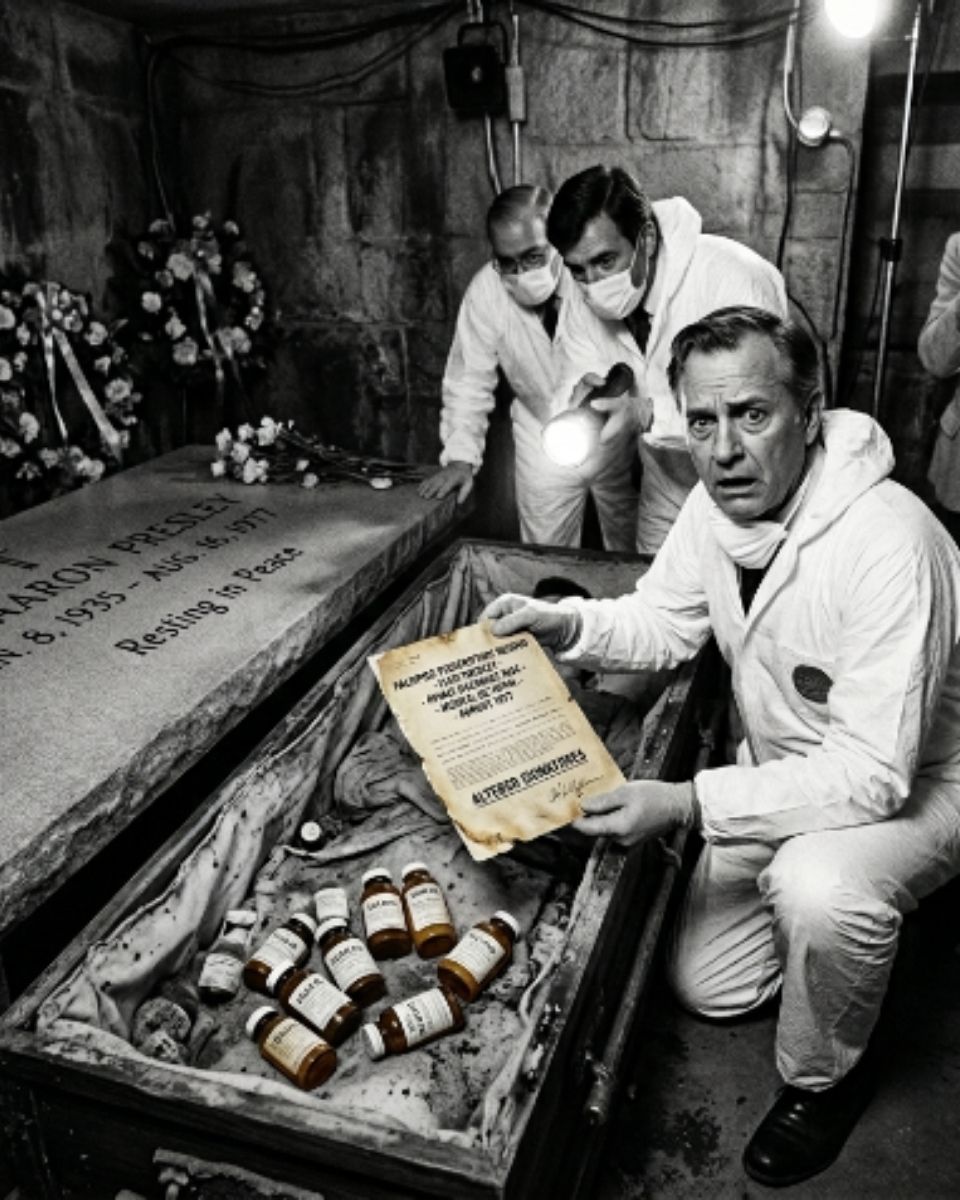 The decision to open the tomb was not random. It stemmed from the discovery of a secret medical archive containing suspiciously altered prescription documents. Names were crossed out, signatures were forged, and massive doses of medication were hidden under alias identities. Scientific intervention has proven that Elvis did not simply pass away from heart failure due to an unhealthy lifestyle. Instead, a distorted medical system and systematic prescription abuse directly led to this tragedy. DNA evidence and bone tissue analysis show extremely high concentrations of synthetic opioids still present in his remains, a testament to a devastating medical betrayal.