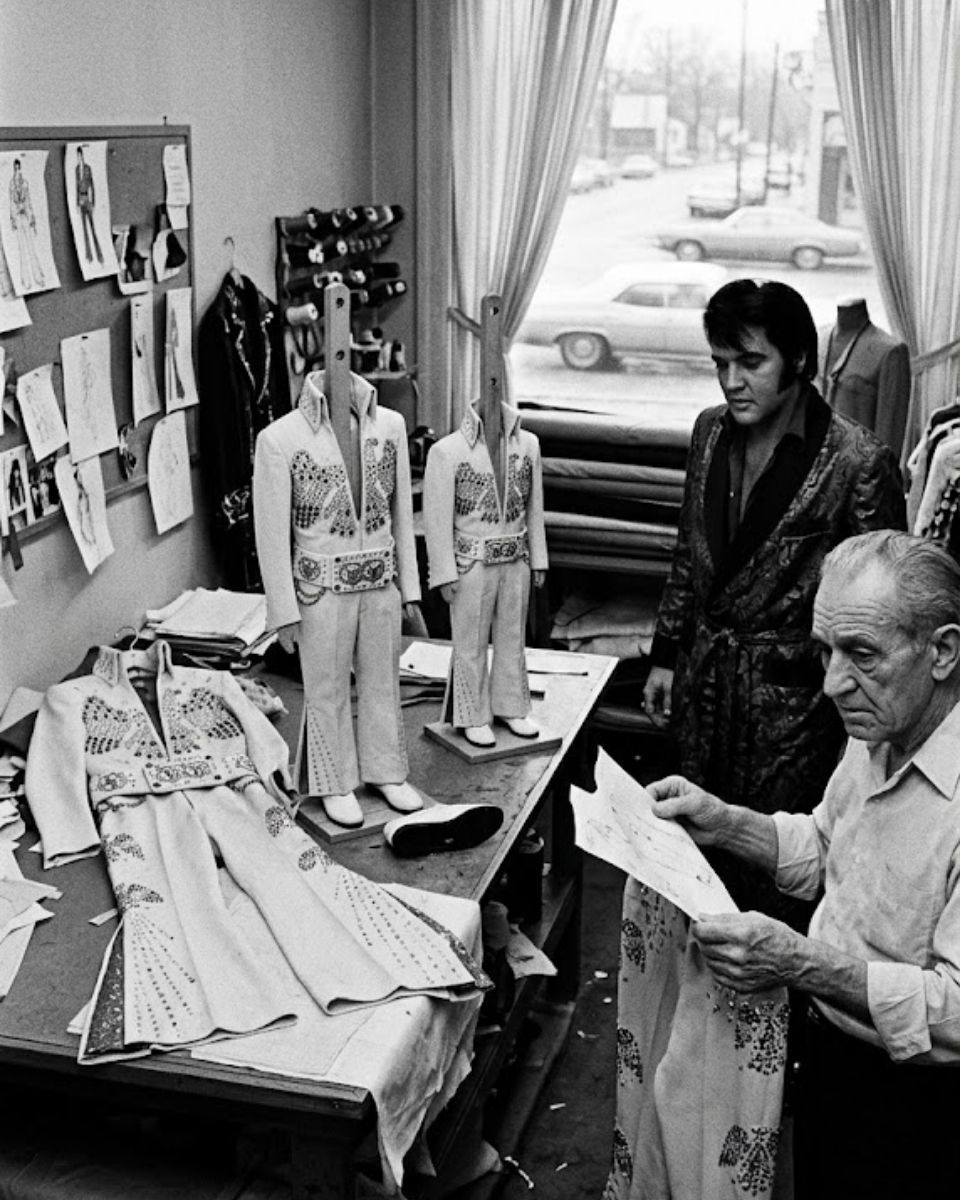 It all began on a fateful afternoon at Albert’s small workshop, where Elvis Presley often came for fittings of his magnificent stage attire. However, this time Elvis did not appear with his usual warmth but carried a heavy expression. He asked Albert to make three identical suits, matching every detail of his most famous stage outfit, including the specific sheen and the stitching pattern along the lapels. But the most shocking news lies in the fact that these suits were not meant for Elvis himself.