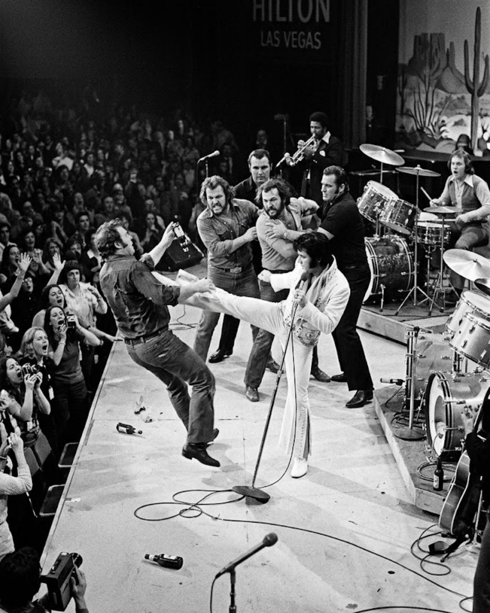 Shocking News from that night highlights the incredible physical resilience of Elvis Presley. As one of the intruders broke through the line of bodyguards and lunged at the singer, Elvis did not retreat. Utilizing years of intense karate training, the King delivered a swift, calculated strike that sent the attacker flying off the stage. This was not a choreographed move for a movie; it was a raw display of self defense from a man who knew his life was on the line. Even as his band continued to play through the pandemonium, Elvis proved he was more than just a performer, he was a martial artist capable of handling real world threats with lethal precision.