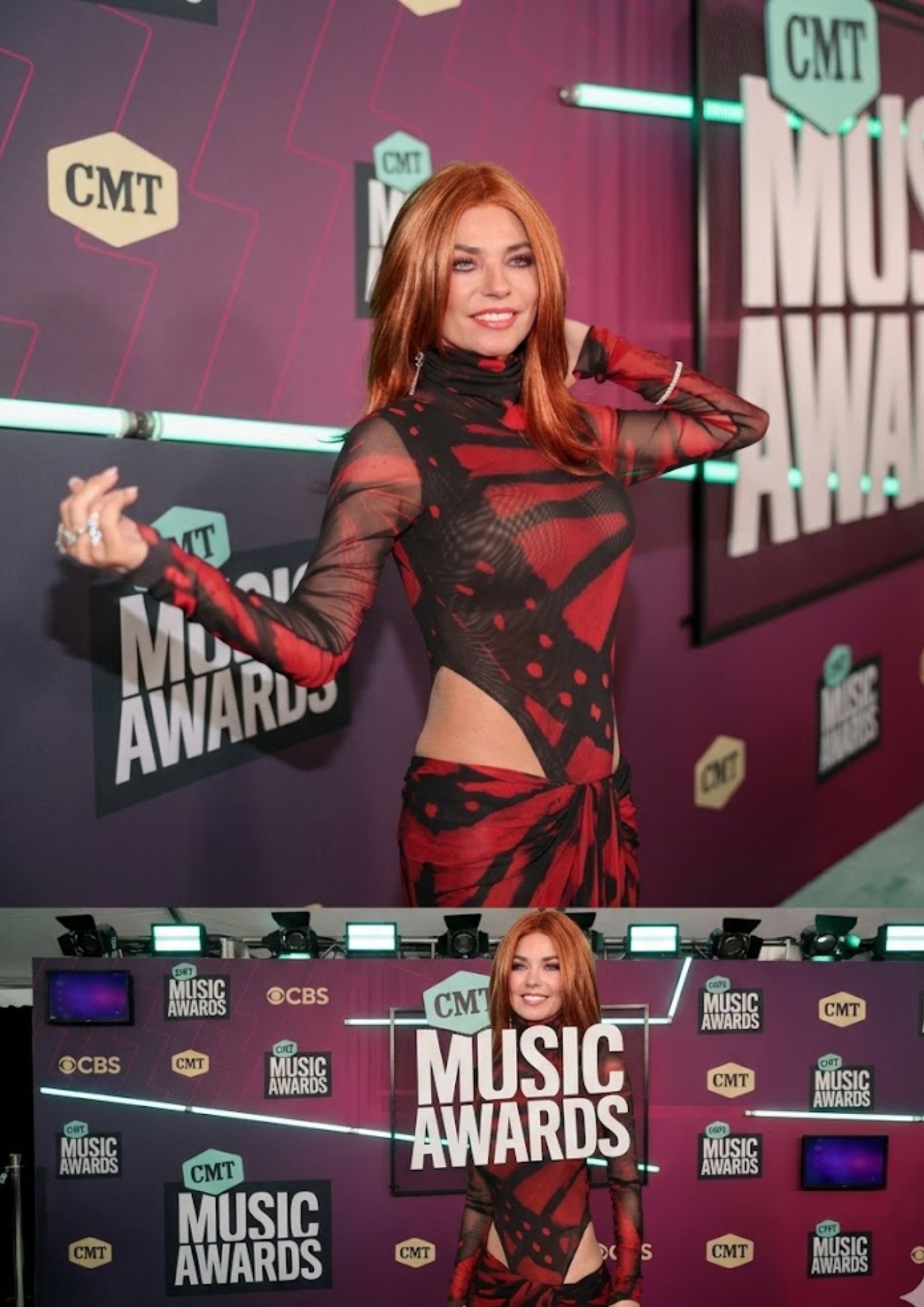 The artist is seen wearing a sleek black jacket featuring shimmering embellished details along the sleeves—a perfect fusion of Rock ‘n’ Roll edge and classic elegance. Her voluminous brunette waves and signature radiant smile don’t just evoke the golden era of the “Come On Over” album; they solidify her status as a cultural icon who never loses her spark.